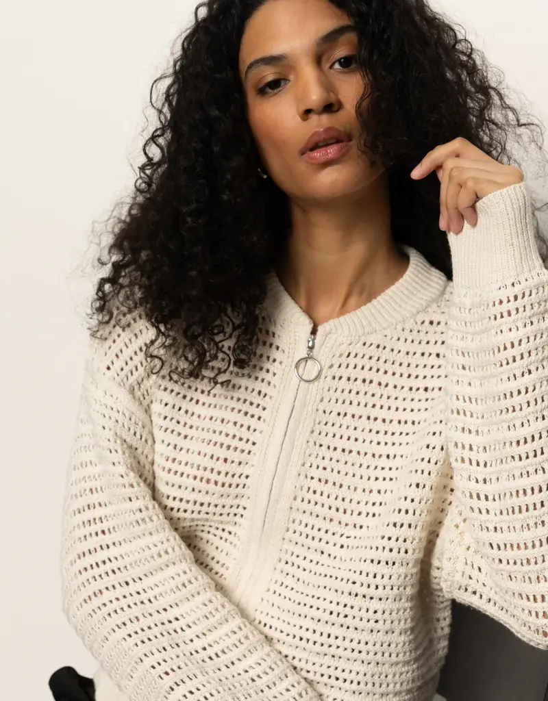 Airy open stitches texture a zip-front cardigan knit from slubbed cotton yarns in a slouchy bomber silhouette.